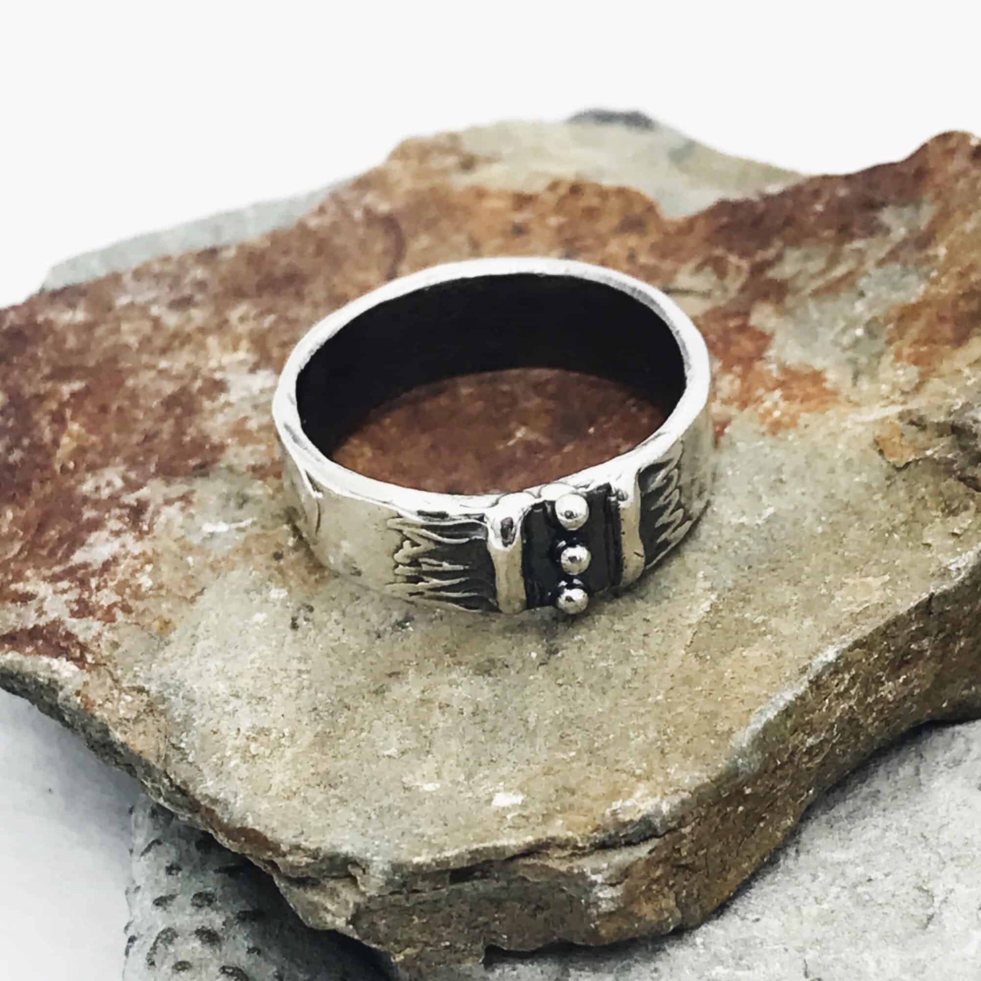SImple ring with softly textured band, center piece is a raised design with three dots flanked by two lines, one on either size.