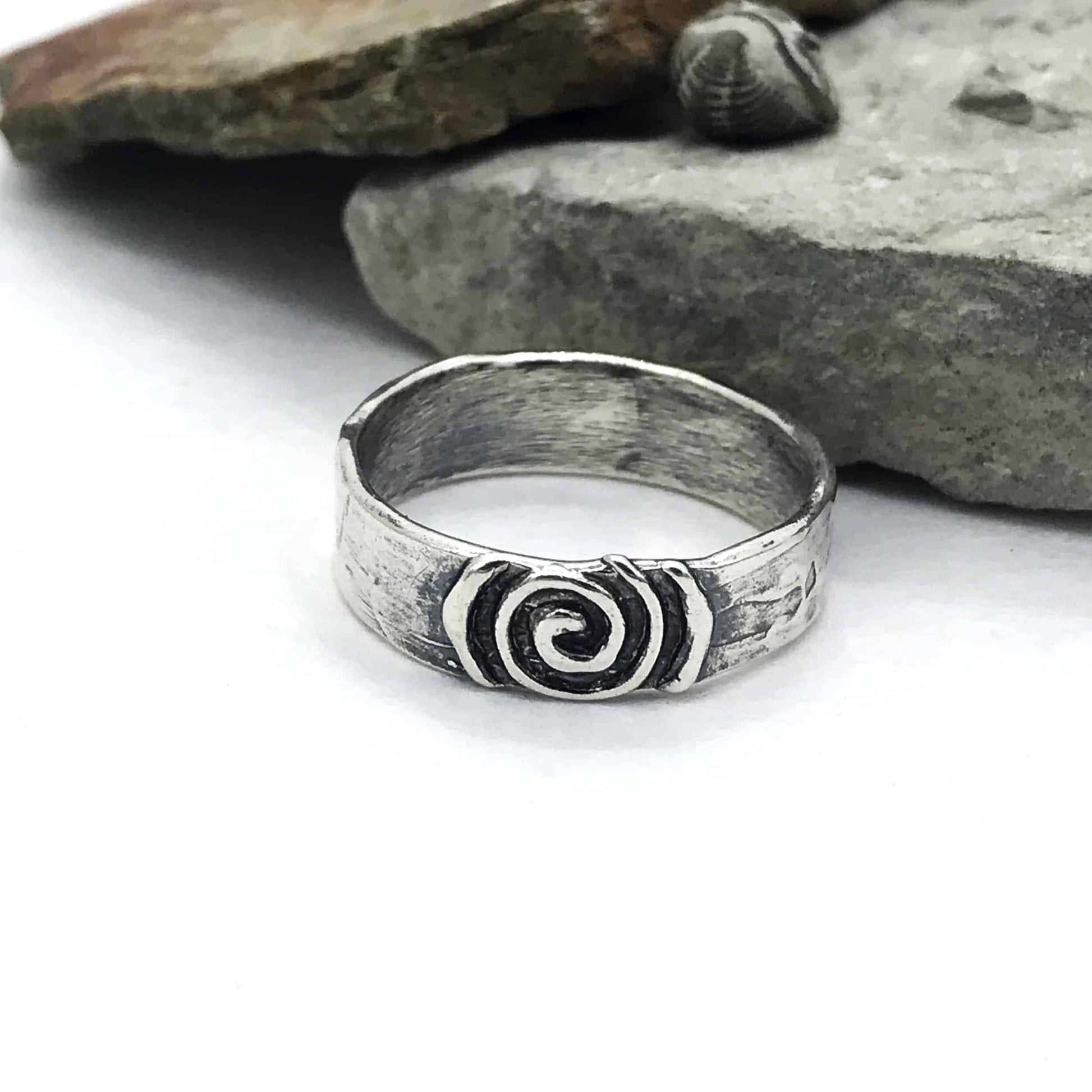 SImple ring with softly textured band, center piece is a life spiral with a raised design.